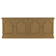 This four-door sideboard offers a refined blend of storage and style, perfect for dining and entertaining spaces. Crafted from pine, plywood, and pine veneer, it features a beautifully planked top that enhances its rustic charm. Raised panel doors lend a classic, sophisticated appeal, while the spacious interior includes two nested drawers with self-closing metal slides for effortless organization. This versatile piece functions beautifully as a server, providing ample space for dishware and linens. With its elegant craftsmanship, it also serves as a buffet, adding both convenience and timeless appeal to any home. Key Features: • Four-door sideboard with raised panel doors for a classic, textured look • Pine, plywood, and pine veneer construction ensures lasting durability • Planked top highlights the natural grain with a rustic honey finish • Spacious interior storage includes two nested drawers for organization • Self-closing metal slides ensure smooth and effortless drawer operation • Warm rustic honey tone enhances farmhouse and traditional decor