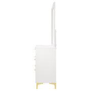 Brighten up your bedroom with the modern glam and cheer of this six-drawer dresser, a statement piece that brings a light and airy feel to contemporary spaces. Gold-finished pulls and bracket-style legs infuse the piece with a touch of luxury, while the crisp white finish keeps it sleek and dignified. Ideal for anchoring your focal wall or complementing a vanity area, this long and narrow dresser is a splendid addition. The accompanying contemporary mirror, framed in white, adds height and elegance, creating a formal vanity when placed atop the dresser. Key Features: • Modern glam six-drawer dresser with gold-finished pulls • Bracket style legs for a luxurious look • Crisp, white finish for a sleek presence • Rectangular contemporary mirror with a minimalist white frame • Adds formal elegance to bedroom vanity areas