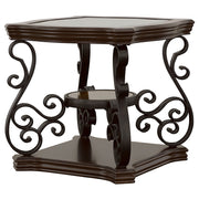 This elegant end table brings a blend of classic style and practicality to any living space. The clear tempered glass top offers a durable and polished surface, complemented by ornate scrollwork on the dark bronze powder-coated metal legs. The dark merlot finish highlights the engineered wood and cherry veneer construction, while the small middle shelf adds functionality with a polished wooden surface. Perfect for enhancing your living room with timeless charm and versatile utility. Key Features: • End table with a clear tempered glass top for a durable and elegant surface • Metal legs with a dark bronze powder-coated finish enhance sophistication • Dark merlot wood finish complements engineered wood and cherry veneer • Middle shelf with a polished wooden surface adds storage or display options • Intricate scrollwork design provides a classic and ornate aesthetic • Built with durable mixed materials of metal, wood, and veneer