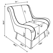 With a stylishly curvy silhouette, this accent chair offers an artisan approach to furnishings in your custom casual or semi-formal space. Embellish a living room or family room with a chic chair creating palette versatility and a romantic ambiance. Relax in style and beauty with a delicious design in seating, starting with plywood framing and soft textured velvet upholstery. Alluring flared silhouetting on its full-length armrests adds comfort in conjunction with an extra-wide build, as a comfy attached seat invites hours of pleasing leisure. Bring in a hint of retro style with slender, splayed gold metal legs and button caps that create a whimsical satellite effect. Key Features: • Stylishly curvy silhouette for custom casual or semi-formal space • Plywood framing and soft textured velvet upholstery for chic chair • Alluring flared silhouetting on full-length armrests for comfort • Extra-wide build with comfy attached seat for hours of leisure • Slender, splayed gold metal legs and button caps for retro style