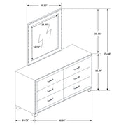 Revitalize your sleeping space with this eye-catching and elegant velvet-upholstered dresser, a statement piece that starts conversations. Six spacious drawers, accented with nailhead trim, offer ample storage, while the tapered legs enhance its stunning regal design. This dresser transforms your sleeping space into a royal retreat. The exquisite mirror, upholstered in matching velvet fabric with nailhead trim, completes the set, elevating your glam-style bedroom into one fit for royalty. Key Features: • Six-drawer dresser and mirror set wrapped in soft grey velvet upholstery • Chrome nailhead trim outlines both the mirror frame and dresser edges • Crystal drawer pulls on each drawer front coordinate with mirror accents • Mirror features clean-lined silhouette with plush velvet frame • Chrome metal legs offer stability and support beneath the dresser • Constructed with engineered wood, velvet, and crystal-accented hardware