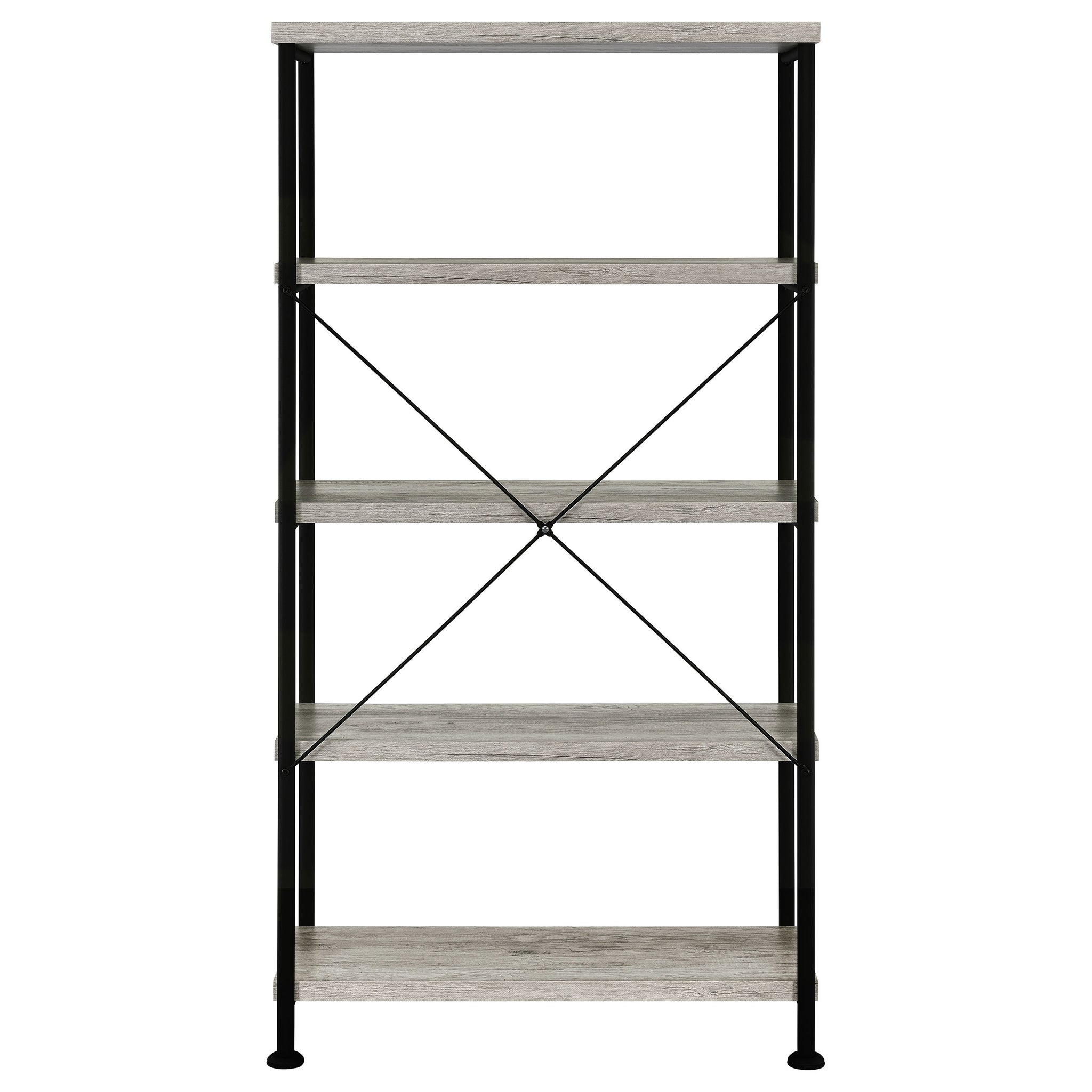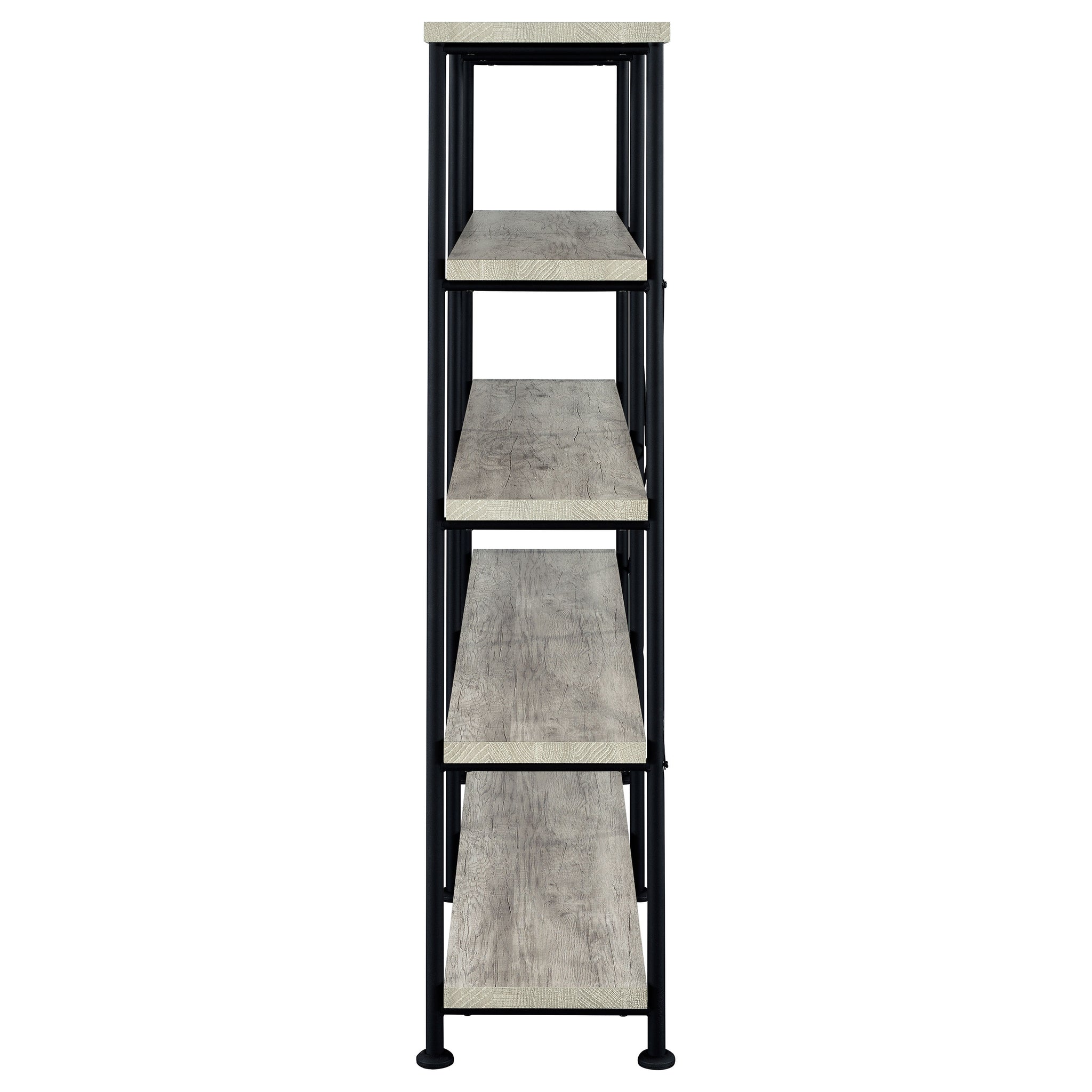 Embrace a traditional look with contemporary upgrades. Choose this bookcase to organize accents and books in a transitional space. Minimalist styling reflects a classic dynamic reflecting a hint of industrial aesthetics. Find plenty of room on four side shelves to display books and decor. Select from finishes that suit your space. Key Features: • Double bookcase with four extra-wide tiers for ample display and storage space • Rustic nutmeg finish offers a warm wood tone with industrial character • Black powder-coated steel frame enhances contrast and structural stability • Crossbar detailing on the back reinforces support without adding bulk • Open shelf design keeps contents visible and accessible from all sides • Made from engineered wood, melamine paper, and heavy gauge metal