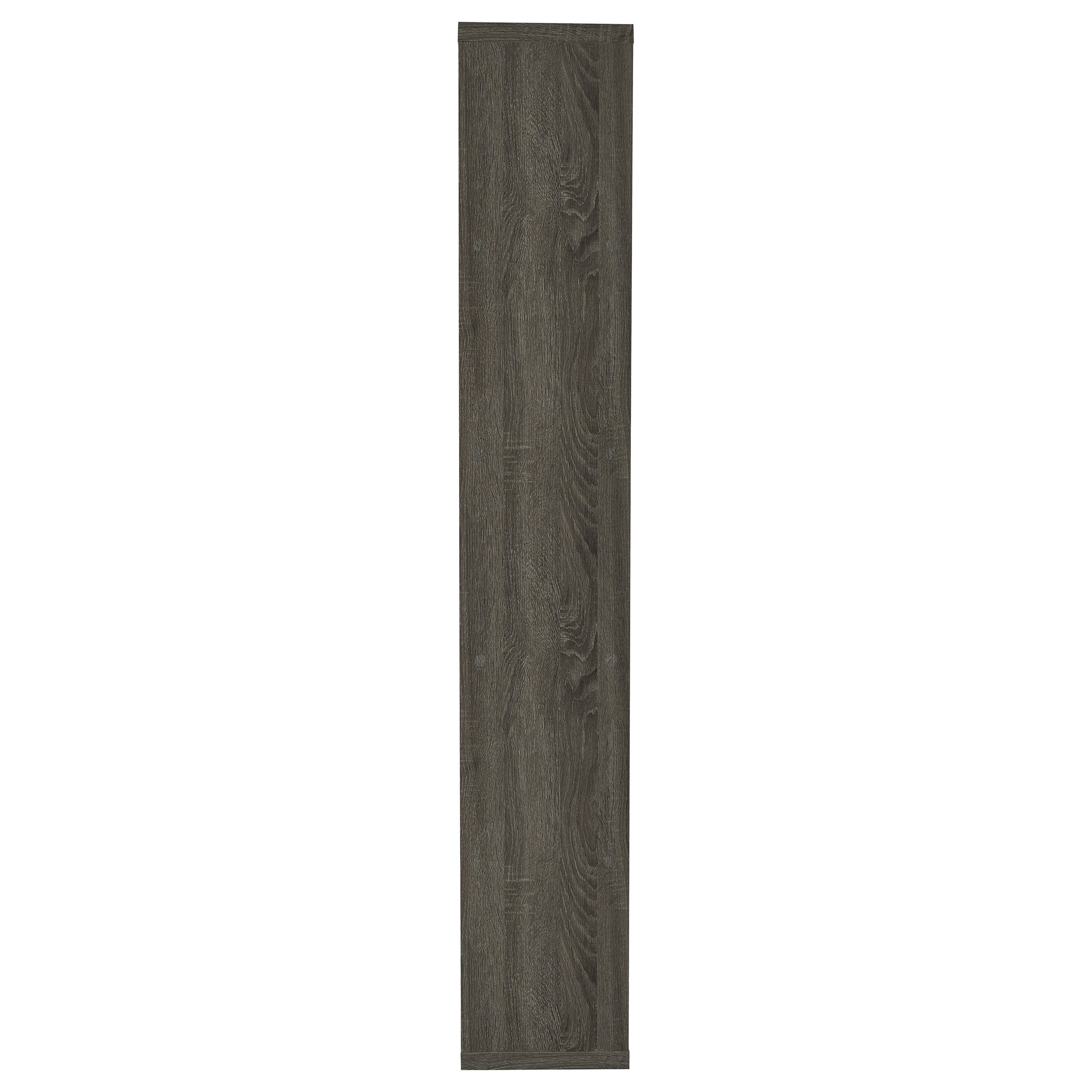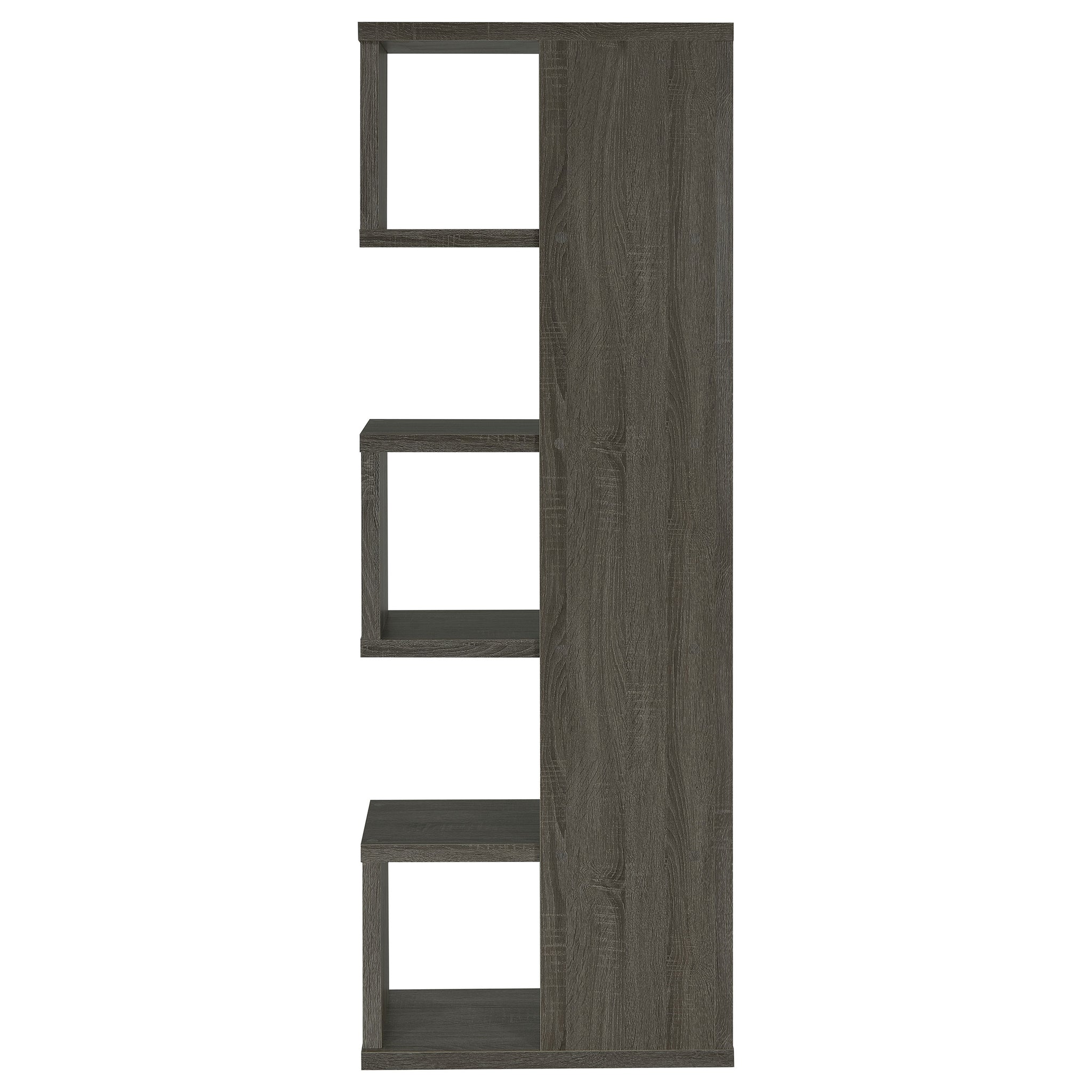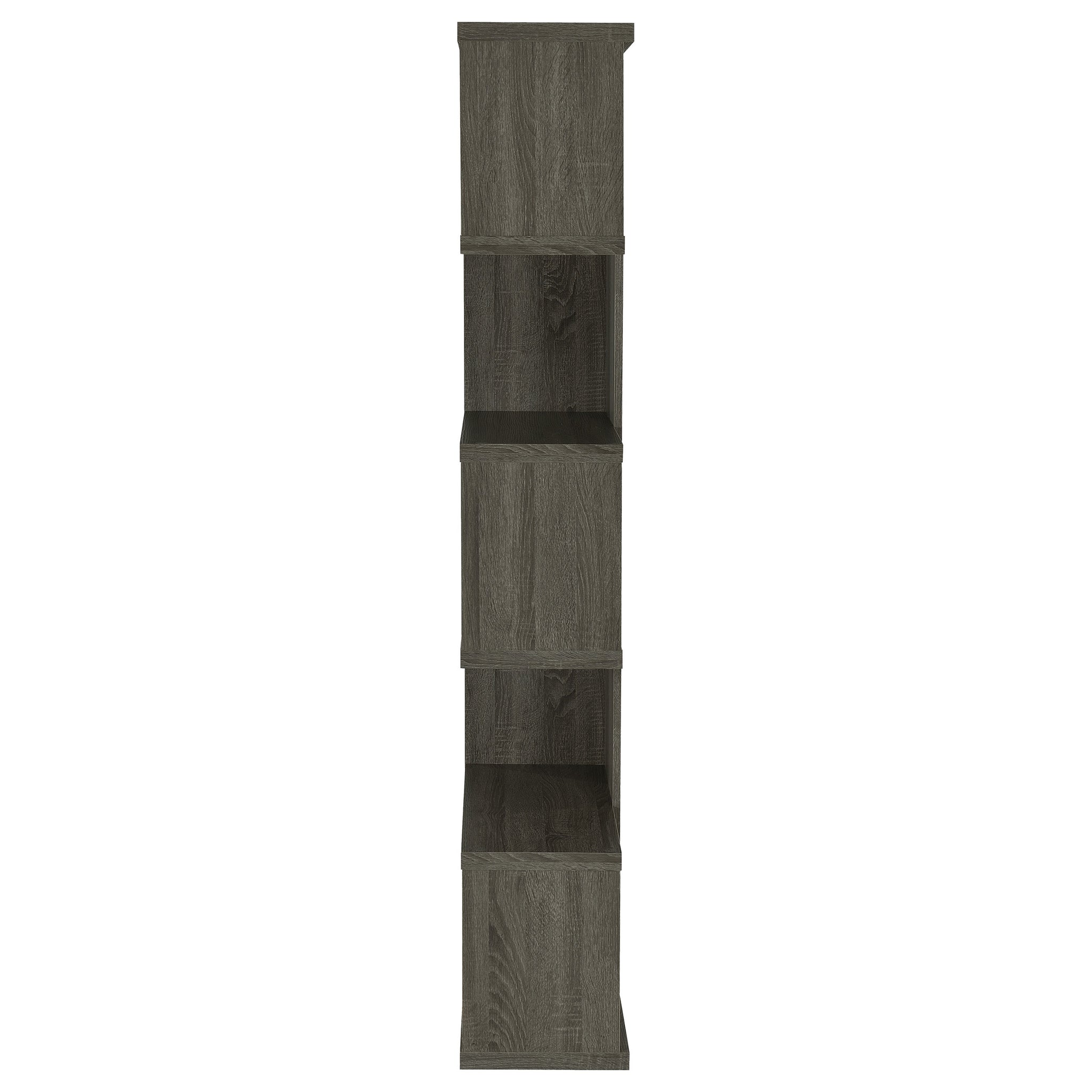 Purposeful imbalance tells a story. Designed with a whimsical profile, this bookcase brightens up a contemporary space. A visually pleasing arrangement of five tiers creates shelf space for books and decor. Finished in a cool weathered grey, it provides versatility and design power. Make this bookcase a focal point in a home office or casual room. Key Features: • Asymmetrical five-tier bookshelf in weathered grey laminate veneer • Offset shelf layout delivers artistic presence and visual rhythm • Crafted from engineered wood and scratch-resistant laminate • Compact vertical profile ideal for smaller home office setups • Versatile neutral finish coordinates with rustic or urban interiors • Includes tip-over restraint for enhanced safety and stability