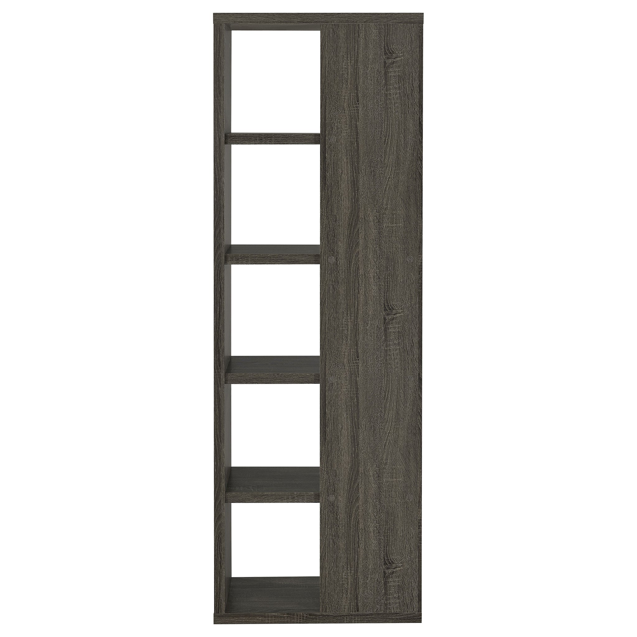 Add a touch of modern charm to any room with this stylish bookshelf in a weathered grey finish. Designed with a mix of open and backed shelving, it brings visual intrigue and versatility to your storage needs. Crafted from engineered wood and finished in eco-friendly melamine veneer, this unit offers five spacious tiers perfect for books, décor, and keepsakes in a contemporary home office or living space. Key Features: • Modern bookshelf with five staggered shelves for stylish organization • Weathered grey finish adds a rustic yet contemporary visual appeal • Open-end shelf design provides dimension and lightness to the silhouette • Ideal for displaying books, framed photos, or small potted plants • Made of engineered wood with a durable melamine veneer for longevity • Compact footprint suits apartments, home offices, or cozy reading corners