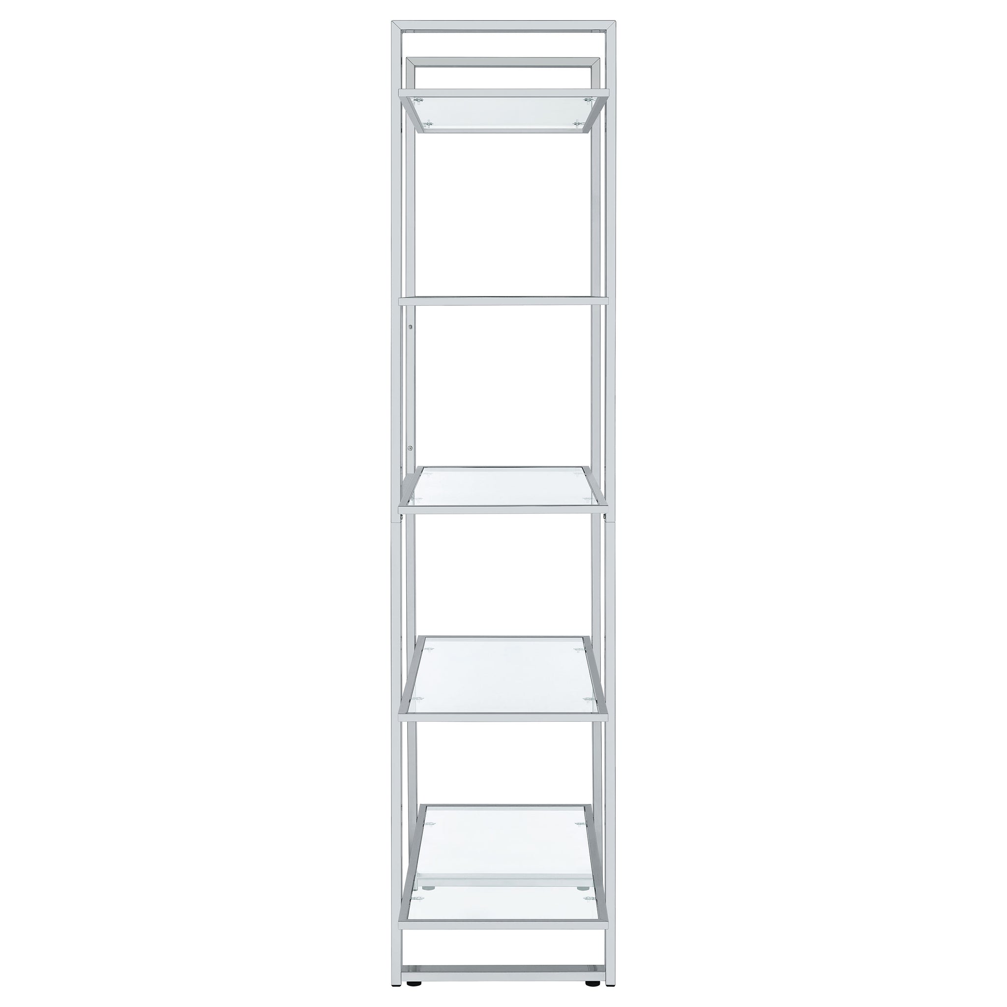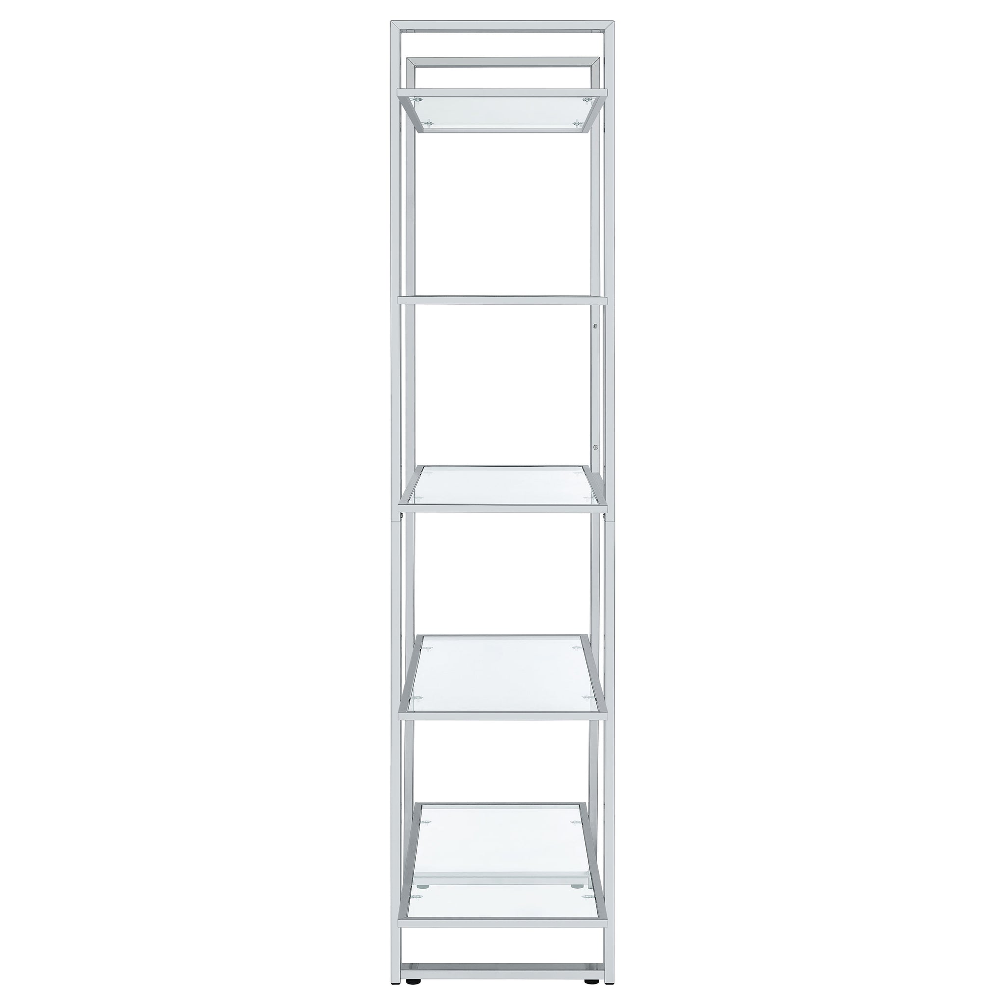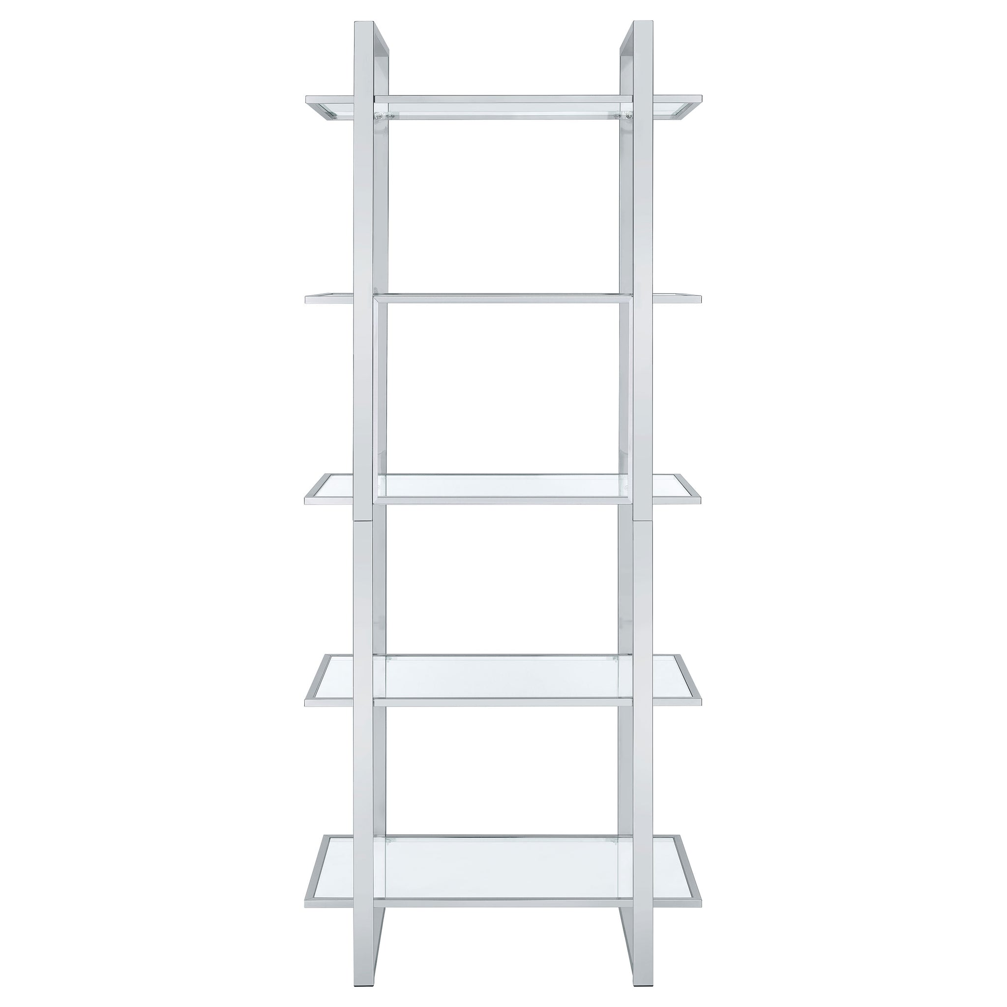 Create a well styled living space that radiates modern luxury. This contemporary bookcase delivers sleek lines of metal in your choice of gorgeous, polished finishes. The shelves are made with tempered glass for smooth, sturdy support. With five shelves total, it offers ample space to display photos, keepsakes, and more. Perfect for a living room, home office, or den, this fresh, modern bookcase is a fabulous choice for any home. Key Features: • Contemporary glass bookcase with five clear tempered glass shelves • Polished chrome frame creates a reflective and open visual effect • Electroplated metal structure enhances durability and shine • Tempered glass shelves offer strong support for books or display • Sleek vertical profile fits modern offices, dens, or studios • Includes tip-over restraint for secure placement in any room