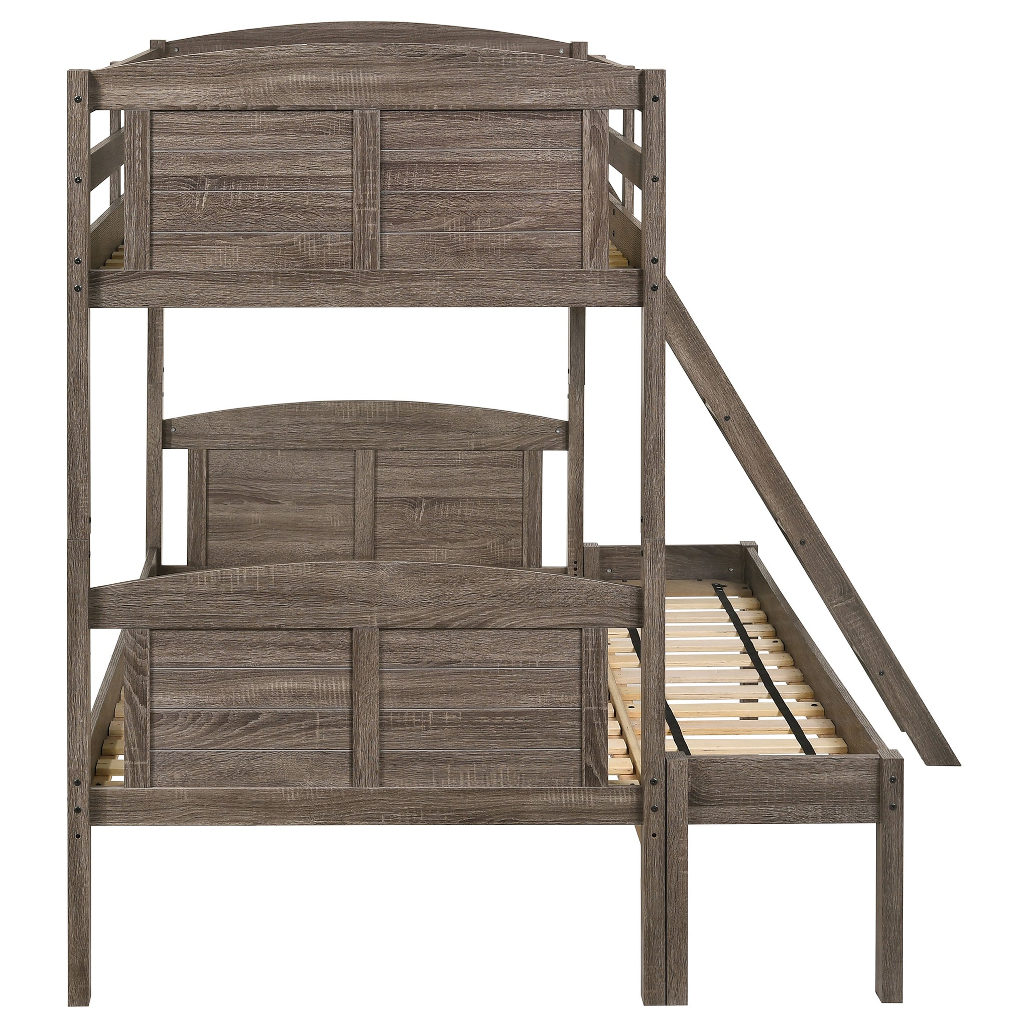 A casual country vibe carries the space with this rustic bunk bed, perfect for compact bedrooms and shared sibling spaces. A weathered brown finish lends a neutral hue to transform a space into a serene, restful retreat. Along the top bunk are safety guardrails to keep younger ones secure as they sleep soundly through the night, complete with a built-in ladder for climbing up. The arched headboard and footboard offer grace and style, along with the plank paneling as the bottom bunk invites baskets, bins and more to organize personal items. Last but not least, this versatile bunk bed can be separated to create individual beds when siblings wish for their own space. Key Features: • Twin over twin bunk bed finished in weathered brown • The top bunk includes matching slatted guardrails and a built-in ladder for easy access • This twin over twin bunk bed can be divided into two completely independent beds • Slat kit included • Constructed with solid rubberwood, plywood, MDF and engineered laminate