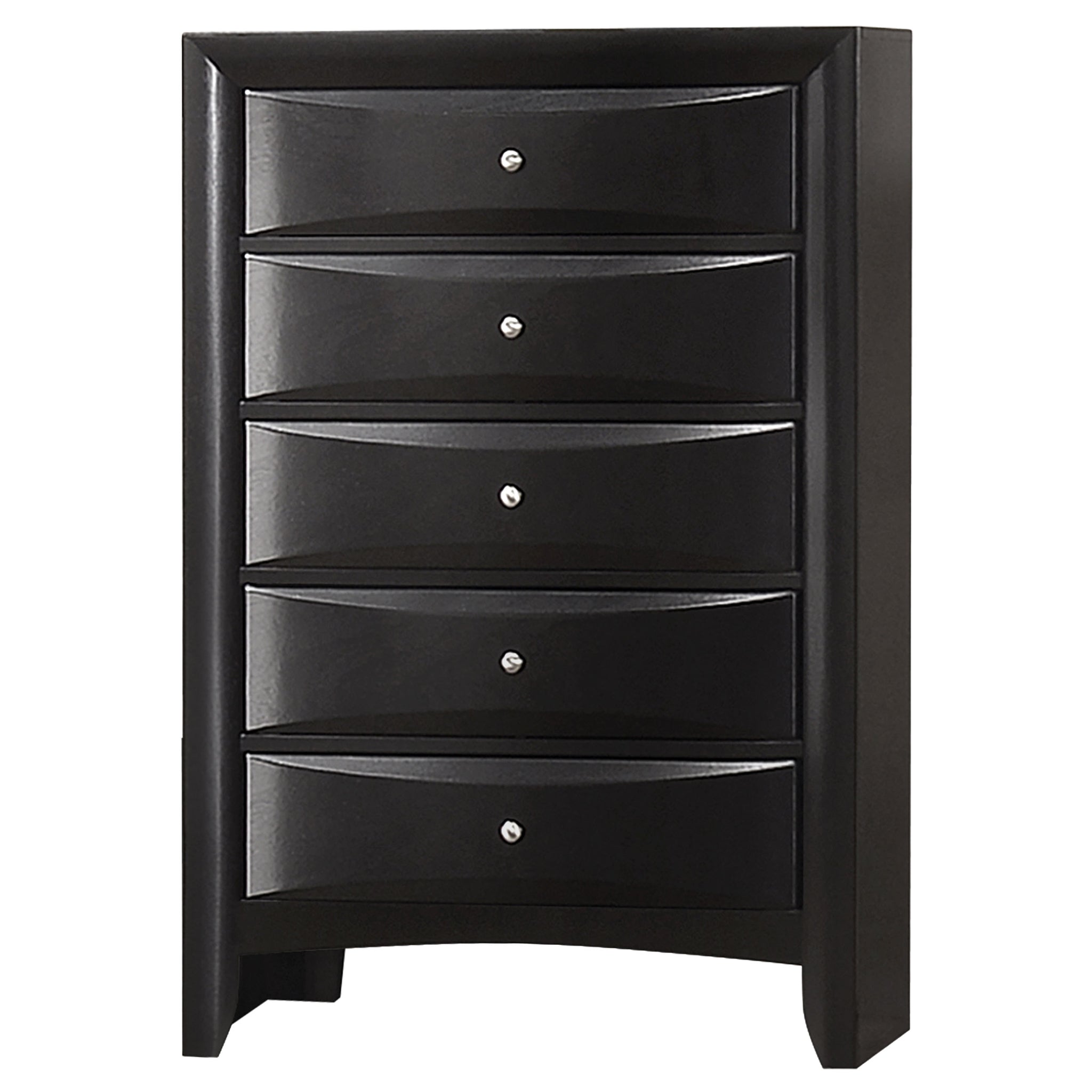 Keep your bedroom organized with this five-drawer chest that blends transitional style and practical design. Finished in a sleek black tone, it features chambered drawer fronts for a sculpted, dimensional look accented by brushed nickel hardware. The spacious drawers glide smoothly, providing ample storage for clothing, linens, and accessories. Built from rubberwood, engineered wood, and okume veneer, this durable chest brings lasting quality and refined simplicity to any bedroom setting. Key Features: • Five-drawer chest with sleek transitional silhouette and finish • Chambered drawer fronts add sculpted depth and dimensional style • Smooth-gliding drawers provide ample everyday storage capacity • Brushed nickel hardware adds subtle metallic contrast and shine • Constructed from rubberwood, engineered wood, and okume veneer • Ideal for organizing clothing, linens, and essential accessories