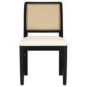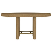 This dining set blends modern craftsmanship with natural textures for a refined yet inviting feel. The dining table features a trestle base with an antique brass-finished metal stretcher bar, adding stability and contrast. Rounded corners soften the rectangular top, while a removable 18-inch leaf allows for flexible seating. The dining chairs feature handwoven cane backrests, solid wood frames, and Pirelli webbed seat cushions upholstered in beige linen-like fabric for lasting comfort and support. A wood grain finish enhances the natural beauty of the materials. Key Features: • Dining set in sand wash finish includes a trestle table and handwoven cane-back chairs for style • Antique brass metal stretcher bar adds structural durability and visual appeal • Table expands effortlessly with a removable 18-inch leaf for extra seating • Handwoven cane backrests enhance texture and bring a natural aesthetic • Foam-padded beige fabric upholstered seat cushions provide lasting comfort and support • Solid wood, white ash veneer, and metal construction ensure strength and longevity