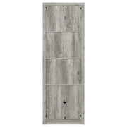 Tall and slender, this modern media tower is the perfect complement for your entertaining needs in both compact and larger spaces. Organize media, books, and implements on shelves and interior shelves, staying organized and uncluttered. Melamine construction features a distressed weathered gray finish with grain-like markings, offering rustic vibes. Find space on three fixed shelves and one adjustable shelf, all ready to separate and store gaming supplies, media, or books. A single black finished metal hardware pull offers an ideal match. Key Features: • Modern media tower suitable for various space sizes • Organize effortlessly with shelves and interior compartments • Distressed weathered gray finish for rustic charm • Three fixed and one adjustable shelf for versatile storage • Single black-finished metal hardware for a cohesive look