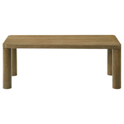 This coordinated table set unites organic warmth with geometric elegance. Rounded legs and gently curved corners bring softness to the structured forms, while the wood texture grounds the overall design. Whether used as a living room table set or occasional table pairing, the ensemble invites visual calm and versatility in one cohesive design statement. Key Features: • Occasional table set featuring both coffee table and end table designs • Brown oak finish offers an earthy look with visible wood grain detail • Rounded corners and cylindrical legs bring softness to the clean shape • Crafted from solid rubberwood, engineered wood, and white oak veneer • Tables provide functional surface space for living room needs • Cohesive set enhances modern styling with balanced proportion