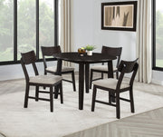 Gracefully tailored for intimate meals and lingering conversation, this five-piece round dining set brings charm and function to the heart of your home. The drop-leaf table blooms with ease, offering flexibility for everyday dining or special moments. Each chair cradles you in comfort with its curved backrest and plush ivory seat. Rich in dark coffee tones and crafted from rubberwood, mango, and engineered wood, it weaves elegance and warmth into every shared gathering. Key Features: • Five-piece round dining set with drop-leaf table for casual and expanded dining use • Dark coffee wood finish lends richness and warmth to compact dining spaces • Drop-leaf top folds down to conserve space when not in use • Chairs feature gently curved backs and soft cushioned seats in ivory fabric • Crafted from rubberwood, mango, engineered wood, foam, and fabric upholstery • Perfect for cozy kitchen corners, apartments, or breakfast nooks