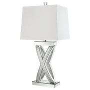 This table lamp features a sculptural X-shaped base accented with shimmering mirrored panels and faceted acrylic crystal inlays. Its bold silhouette and reflective finish create a dramatic presence, while a rectangular white shade provides soft ambient light. Designed to stand out in any glam-inspired space, the lamp fuses artistic form with modern shine—perfect for entryways, bedrooms, or living room consoles seeking a touch of sparkle and geometric sophistication. Key Features: • Table lamp with sculptural X-frame and glamorous mirrored base design • Faceted acrylic crystal inlay adds shimmering visual texture and depth • Rectangular white shade delivers clean lines and diffused light • Mirrored finish reflects surrounding elements to enhance brightness • Striking silhouette works well in glam and contemporary interiors • Ideal for bedside, console, or living room table placement