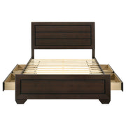 Indulge in a love of basic nature. Fresh, inspiring aesthetics combine to make this bed a great choice for a transitional room. Linear design elements create optically pleasing balance while a washed taupe finish results from a gorgeous patina in greyish-brown. Side storage increases utility. This bed serves beautifully through a series of room redesigns. Key Features: • Storage panel bed with bold rectangular framing and a streamlined silhouette • Washed taupe finish highlights wood grain texture with contrasting black grooves • Includes dual drawers on each side rail for concealed underbed storage • Recessed panel headboard offers visual depth and structured design • No foundation required thanks to supportive slatted base construction • Engineered wood build with durable laminate veneer and framed case detailing