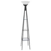 Explore the depths of modern geometric style. With a graceful silhouette, this floor lamp plays up a contemporary theme with a hint of softness. A tapered tower shape body shows off a charcoal black finish, embellished with clear glass shelving at each level. A frosted glass shade and additional down light put finishing touches on this intriguing design. Operates with a three-way switch. Key Features: • Versatile shelf tower floor lamp • Charcoal black finish • Three tiers of clear glass shelving • Frosted glass upright shade • Features additional down light