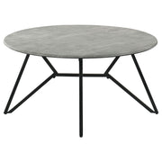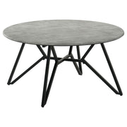 Gunmetal finish hairpin legs offer an industrial edginess to this modern coffee table. Designed with a faux cement top in an elegant round shape, this spacious cocktail table offers a casual, chic space to keep books, cocktails and more. The cement-like top even features a sandy feel for a hint of realist texture. Keep this coffee table in front of a mid-century modern sofa or allow it to take center stage in front of a sectional. Sculptural-like in itself, this coffee table looks stunning in a loft apartment and even lends a minimalist approach to homes. Key Features: • End table with a durable cement-like top resistant to stains and UV light • High-pressure laminate surface prevents scratches and cigarette burns • Gunmetal-finished geometric metal base ensures stability and style • Break-proof and shock-resistant top offers reliable durability • Compact round top perfect for small spaces and versatile use • Hairpin-style legs add an industrial, sculptural design aesthetic
