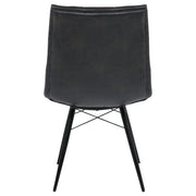 Blending mid-century modern aesthetics with everyday comfort, this dining side chair is a stylish addition to any dining space. Upholstered in charcoal faux leather, its gently curved tufted seat and backrest offer a supportive and inviting feel. Angled metal legs with crossing braces enhance stability while adding a striking visual element. The armless design provides a sleek, space-saving silhouette, making this chair ideal for both casual and formal dining settings. Key Features: • Mid-century modern dining chair with a sleek armless silhouette • Charcoal faux leather upholstery offers a refined and stylish touch • Gently curved backrest and seat provide ergonomic comfort and support • Button tufting adds depth and sophistication to the overall design • Angled metal legs with crossing braces enhance stability and durability • Versatile design complements contemporary, industrial, and modern spaces