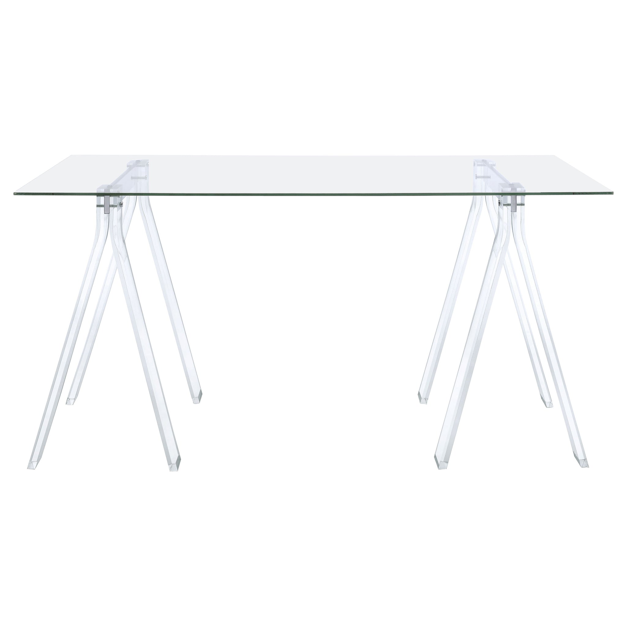 Enjoy an airy workspace with this 59-inch writing desk, pairing a sleek acrylic sawhorse base and a clear tempered glass top. Heavy gauge steel supports, finished in electroplated chrome, connect the legs for added stability and a polished accent. The translucent design keeps your office bright and open, suiting both modern and minimalist décor. Perfect for writing, studying, or creative tasks, this piece merges function and cutting-edge style seamlessly. Key Features: • 59-inch writing desk for a spacious work surface • Clear tempered glass top exudes a chic, minimalist feel • Acrylic sawhorse base brings sleek, modern appeal • Heavy gauge steel supports in electroplated chrome for extra stability • Transparent design keeps your workspace bright and uncluttered • Ideal for home offices, studios, or contemporary setups