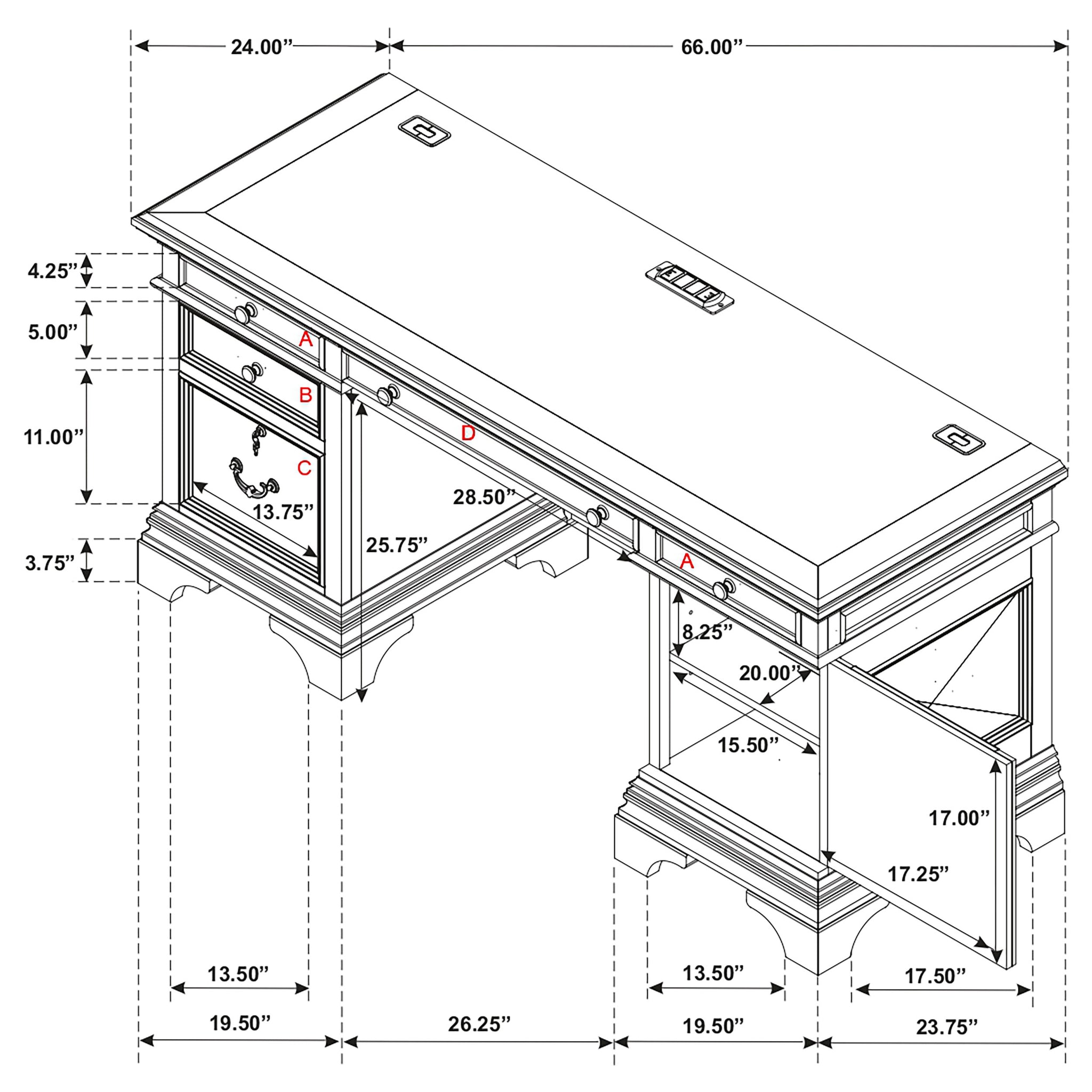 Get creative in how you use and style this attractive Credenza. Its warm burnished oak finish enhances its frame while supported on bracket style legs. Plenty of storage is found within its felt-lined top drawers. Removable dividers allow for extra organization with this piece. Keep your valuables safe and sound within the two lower cabinets that lock with an included key. Key Features: • Credenza with power outlet, USB ports, and locking cabinet • Includes five drawers and two compartments with open shelves • Burnished oak finish paired with antique brass hardware • Felt-lined drawers and removable dividers enhance storage use • Adjustable shelf in cabinet offers versatile functionality • Classic bracket feet and framed construction provide elegance