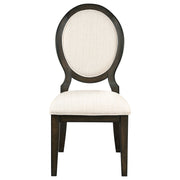 Elegant curves and contrasted finishes collide in this transitional side chair. A lovely addition to a dining space, this stunning chair can be slid up to a table for a comfortable place to sit over a long dinner, inviting you to lean back against its padded oval back and padded seats, each wrapped in a cream linen-like fabric with welt trim details. The timeless design of the Neoclassical oval backrest offers a wood trim that mirrors the rest of the wood frame. Encasing the padded elements is a rich, dark cocoa finish that lends a bold look. Square tapered legs in front and flared legs in back offer a subtle grace that completes this furniture piece. Key Features: • Oval back dining chair in a dark cocoa finish features elegant curves and Neoclassical charm • Cream chenille upholstery highlights the oval backrest and seat with welt-trimmed edges • Square front legs and flared rear legs add structure and grace to the wood frame • Side chair crafted from solid rubberwood, engineered wood, and oak veneer for strength • Foam-cushioned seat and backrest offer plush comfort for daily use or formal gatherings • Refined dining room chair silhouette suits transitional spaces and classic interiors