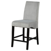 Upgrade your dining space with these elegant counter-height dining chairs. Designed with a classic Parsons silhouette, these chairs feature plush grey velvet upholstery for a soft, luxurious feel. The solid rubberwood frame, finished in deep black, offers durability and a striking contrast. A gently curved seat provides lasting comfort, while a built-in footrest ensures support. Perfectly complementing modern or transitional settings, these chairs add sophistication to any counter-height dining table. Key Features: • Counter-height Parsons chair with a refined and timeless silhouette • Grey velvet upholstery provides a soft, plush, and luxurious feel • Solid rubberwood frame in a deep black finish for durability and style • Gently curved seat enhances comfort for extended dining experiences • Sturdy construction with built-in footrests for added stability and support • Versatile design complements modern and transitional dining spaces