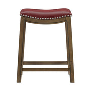 Transitional styling paired with versatility of selection makes the Ordway Collection a perfect addition to your home’s casual dining spaces. Whether pairing with a table that you already have, adding seating to your countertop or casual entertaining space, the three available heights provide several options to choose from. The stool is offered in three heights - 24-inches, 18-inches and 29-inches. The brown finished wood legs and seat apron feature routed accent while the red faux leather seat features nailhead trim that further defines the stool’s profile. 4 additional seat colors are available – brown, green, black and gray – in each stool height.