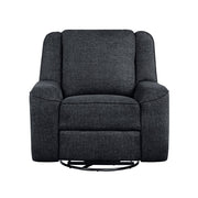 The Monterey Collection presents a modern seating arrangement for your home’s living room, its streamlined profile and dark hue canvas for your decorative styling, and its comfort a respite from the hustle and bustle of daily life. The swivel chair features a manually engaged reclining function, offering a maximized opportunity to stretch out. Ebony-hued chenille fabric upholstery covers the chair.