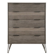 Perched atop metal legs, creating a dramatic statement of contemporary styling, the Urbanite Collection is a perfect reflection of your modern style preference. The chest’s solid acacia wood with acacia veneer is highlighted by a 3-tone grey finish that allows the variance of the natural grain to shine. The horizontal slat design, five-drawer configuration and metal pull tab hardware lend to the clean, contemporary look.