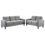 This sofa set blends timeless design with modern versatility, perfect for apartments or cozy living spaces. Featuring classic track arms and precise self-welt detailing, each piece showcases refined tailoring and a compact profile. The grid-tufted back cushions and pocket coil seating offer exceptional comfort and durability, while performance fabric upholstery ensures easy cleaning and long-lasting appeal. Supported by tapered brown legs, this set brings contemporary sophistication and everyday practicality to any home. Key Features: • Small-scale sofa set ideal for apartments, condos, or compact living rooms • Classic track arm silhouette with self-welt detailing adds tailored sophistication • Grid-tufted boxed back cushions deliver plush comfort and timeless appeal • Pocket coil spring seating construction ensures lasting support and resilience • Tall tapered brown legs provide sturdy structure with mid-century inspired flair • Upholstered in durable performance fabric designed for easy cleaning and care