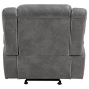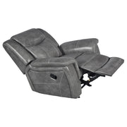 Enjoy superior comfort and smooth motion with this glider recliner chair upholstered in sleek grey faux leather. Designed for everyday relaxation, it features plush padding, overstuffed armrests, and a supportive headrest that enhances lounging comfort. The ergonomic side lever allows quick and easy reclining adjustment, while pocket coil seating and a one-inch cool gel memory foam topper provide exceptional support. Combining luxury and practicality, this recliner delivers the perfect balance of modern design and relaxation._x005F_x000D_ Key Features: • Manual glider recliner chair offers smooth relaxing motion • Grey faux leather upholstery creates a sleek modern look • Plush padded seat, back, and armrests enhance comfort • Ergonomic side lever provides quick easy recline control • Pocket coil seating ensures supportive balanced comfort • Cool gel memory foam topper adds lasting plush softness