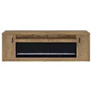 This expansive fireplace media console delivers the perfect fusion of storage and style for spacious living areas. A wide electric firebox rests atop a bed of glistening crushed acrylic crystals, offering fifteen flame color options controlled by a wireless remote. Dual open cubbies provide easy access to devices, while two cabinet doors conceal adjustable shelves for flexible storage. Crafted from engineered wood with a mango-tone laminate veneer, each compartment includes rear cutouts for wire management. Please note that this console does not include a heat function. Key Features: • TV stand flame visualizer console with crushed acrylic crystals and fifteen flame color options • Mango finish showcases natural wood grain with a rustic and warm visual texture • Two cabinet doors conceal adjustable shelves for hidden and customizable storage • Dual open cubbies offer easy access to gaming systems, players, or media devices • Crafted from engineered wood with eco-friendly, scratch-resistant laminate veneer • Accommodates TVs up to eighty-five inches with wireless remote and rear cord cutouts