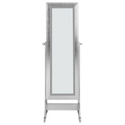 Put the finishing touch on a glamourous bed or dressing room with this stunning floor-length jewelry cheval mirror. Sleek and smooth, the frame features a metallic silver finish. Supportive and intriguing, the delicately curved legs give this mirror its chic personality. Brighten up a space with the light up mirror while keeping your favorite jewelry safe. Angle the mirror upwards or downwards in any bold or neutral decor scheme. Key Features: • Jewelry cheval mirror with LED-lit frame and full-length tilting design • Hidden jewelry armoire includes hooks, ring rolls, and open shelves for storage • Tiltable cheval structure provides adjustable viewing angle for daily use • LED perimeter lighting offers bright, clear visibility while selecting accessories • Freestanding base with curved legs delivers both support and visual appeal • Crafted from engineered wood and mirror for long-lasting functionality and style
