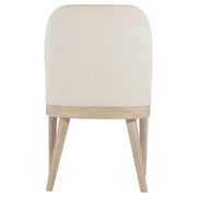 Softly contoured and effortlessly refined, this upholstered side chair brings comfort and poise to the dining room. A rounded back and tailored seat cradle the body in gentle support, while tapered legs add sculptural balance. Wrapped in beige fabric and finished in weathered mango, it pairs inviting texture with natural warmth. Crafted from mahogany, engineered wood, and foam, it offers lasting elegance for everyday meals or special gatherings. Key Features: • Upholstered dining side chair with rounded back for comfort and sculptural simplicity • Weathered mango leg finish highlights natural wood tones and organic texture • Beige polyester fabric provides a soft, neutral layer with tailored visual appeal • Tapered legs offer sleek support and mid-century inspired balance • Crafted from mahogany, engineered wood, and soft foam for durable comfort • Perfect for casual dining rooms or formal spaces needing warm modern seating