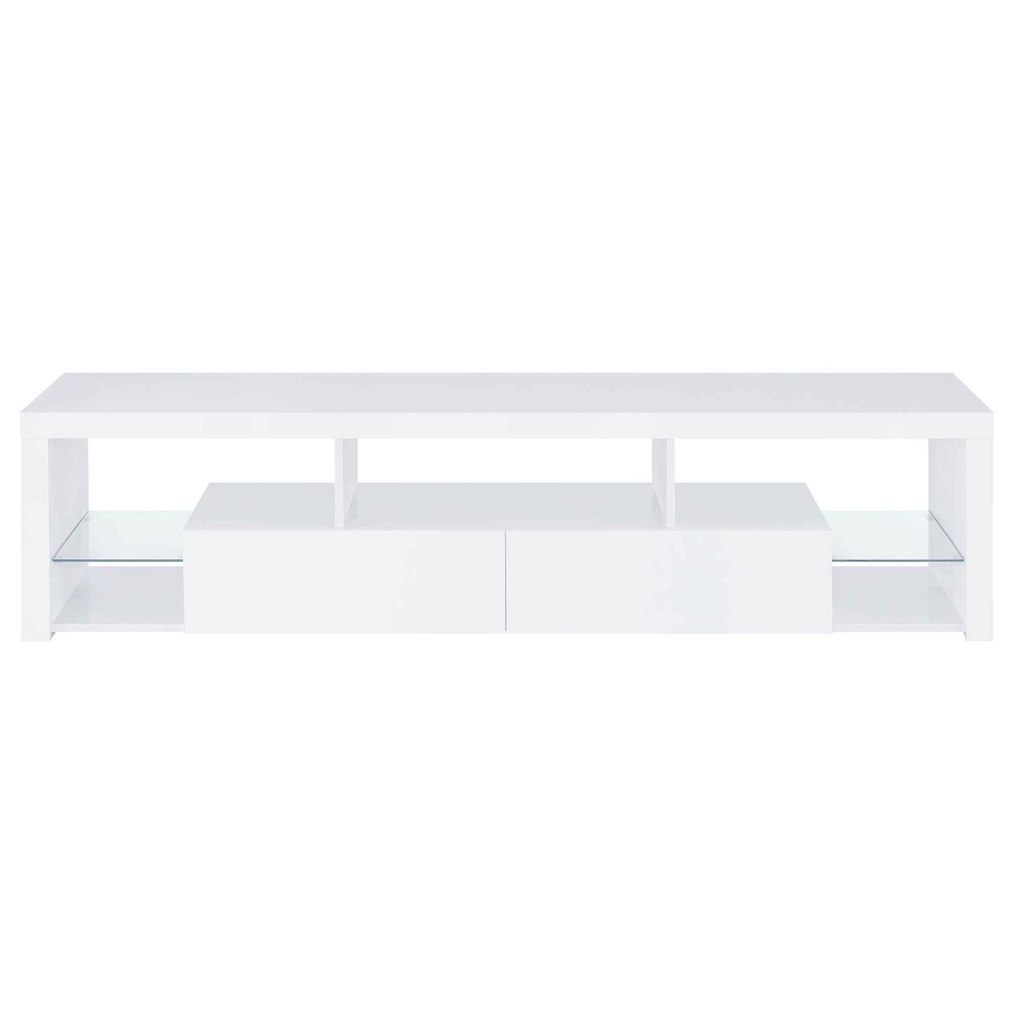 Elevate your entertainment realm with our sleek, modern TV stand. With a pristine glossy white finish and clear glass accents, it exudes elegance. Beyond looks, it's the epitome of functionality. Soft-close drawers glide effortlessly, housing your gadgets, while the glass shelves offer a stylish display. Spacious storage compartments keep your media essentials neatly organized. This stand, a harmonious blend of style and function, becomes an indispensable centerpiece for any contemporary entertainment space. Key Features: • Sleek, modern TV stand with pristine glossy white finish and clear glass accents • Soft-close drawers glide effortlessly, housing your gadgets • Glass shelves offer stylish display • Spacious storage compartments keep media essentials neatly organized • Harmonious blend of style and function for any contemporary entertainment space