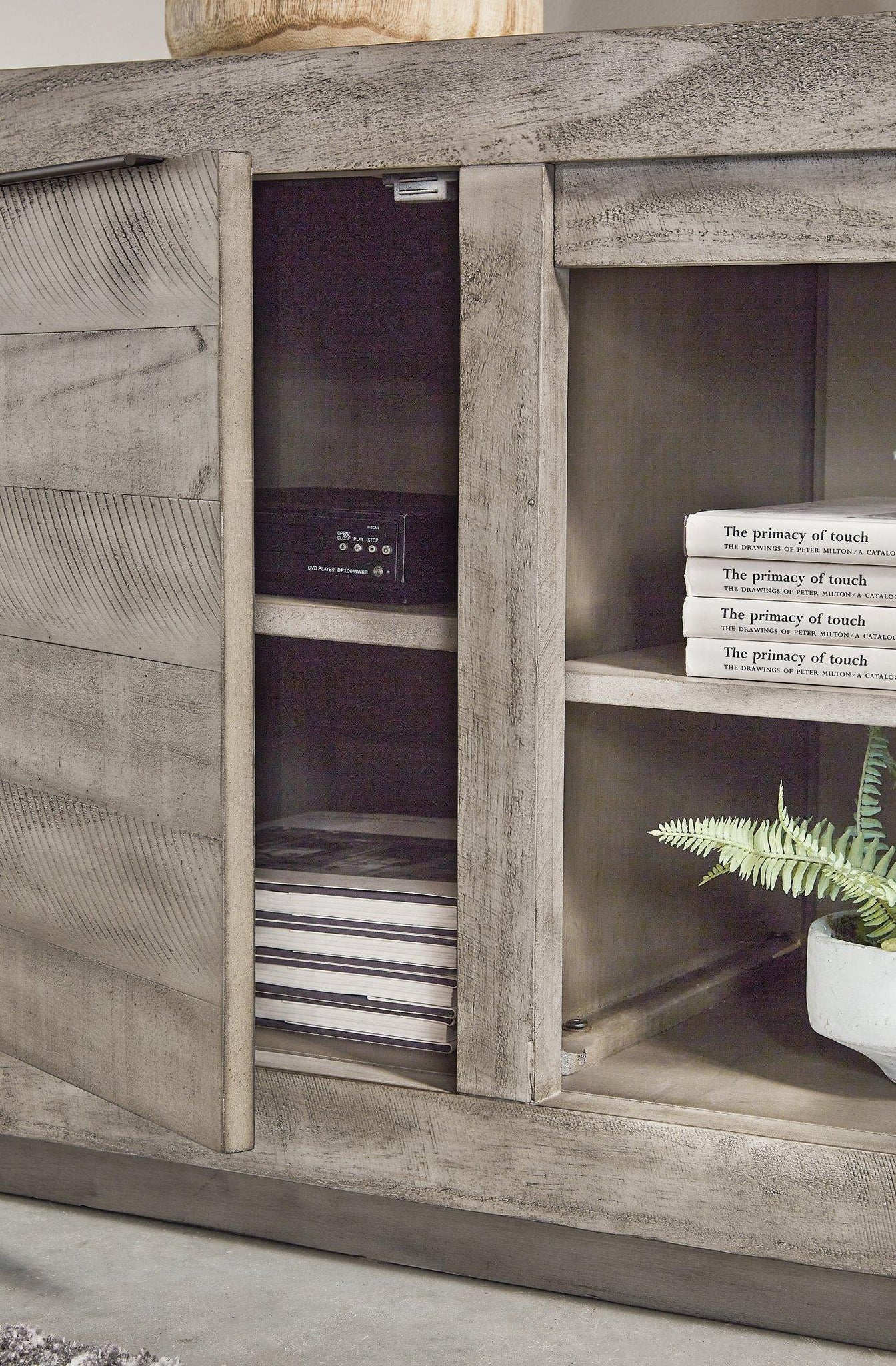 Balancing chic flair with a relaxed sensibility, this extra-large TV stand strikes just the right tone for rustic sophistication. Beautifully clean lines are subtly enhanced with relaxed distressing and saw marks for authentic barn wood character. You're sure to love the convenient open style for easy access to media equipment and accommodating pretty home accents.