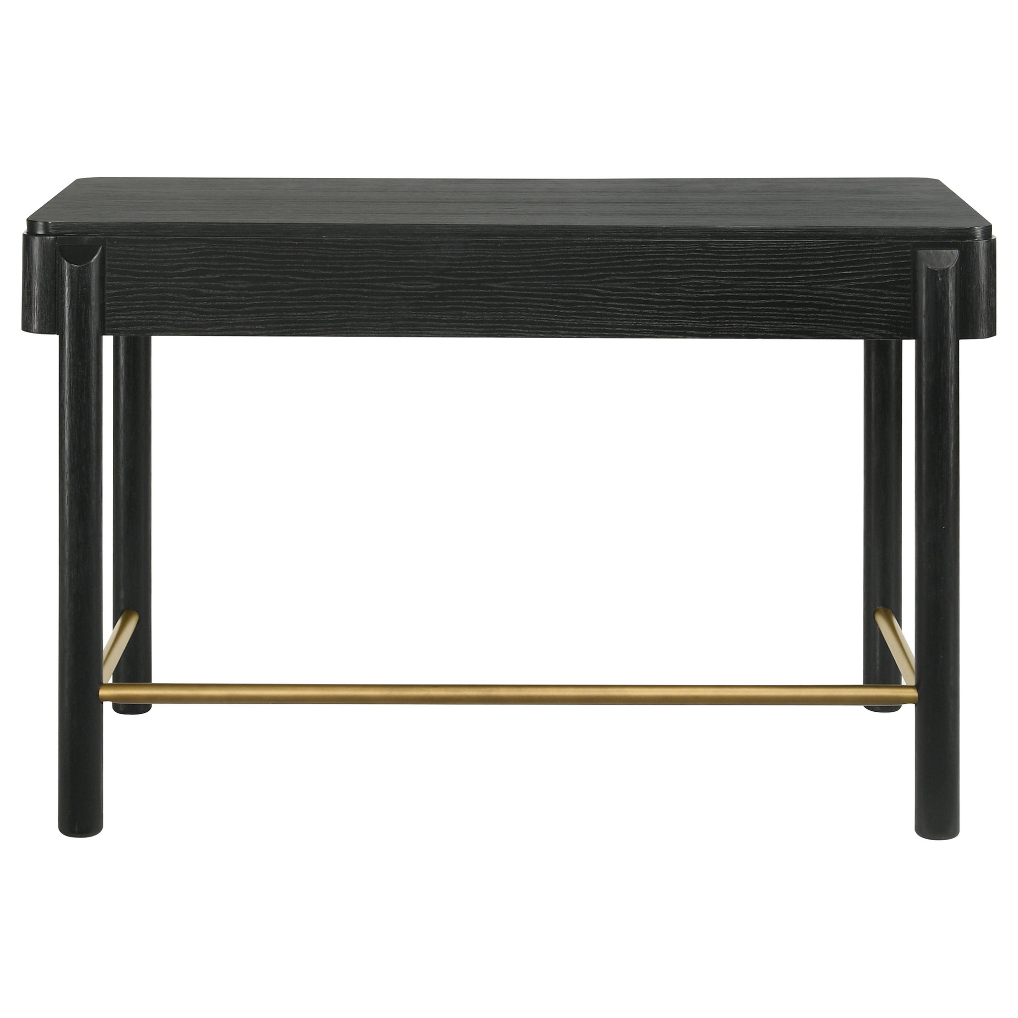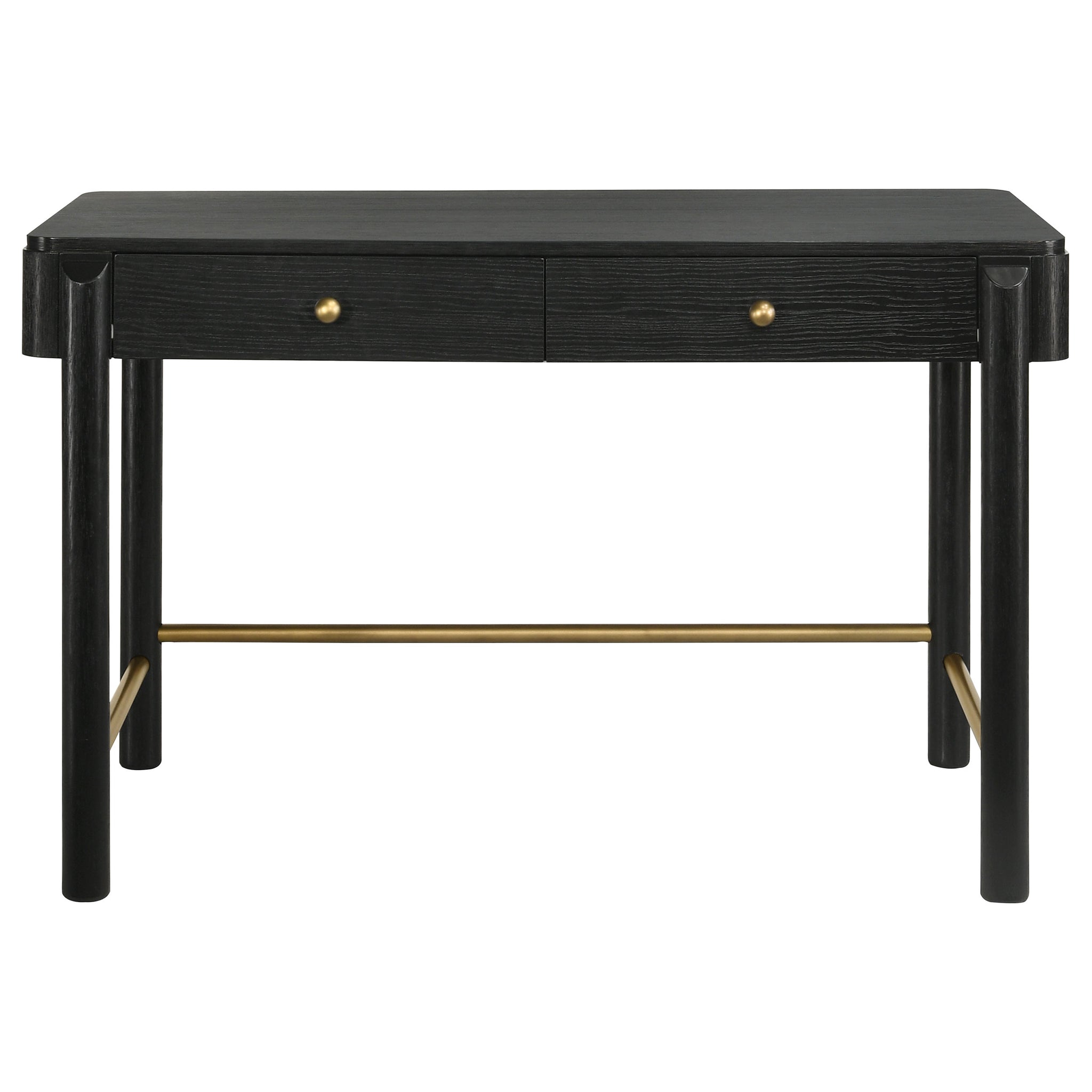 Elevate your space with this modern coastal vanity table, blending natural warmth and subtle sophistication. Its sand wash finish highlights a softly wire-brushed texture, complemented by aged brass accents and rounded edges for a refined aesthetic. Two drawers with metal glides offer convenient storage for beauty essentials or office supplies, while cylindrical legs and brass stretchers provide sturdy support. Ideal as a vanity, writing desk, or console, it brings both charm and versatility to any room._x005F_x000D_ Key Features: • Two-drawer vanity table in sand wash wire-brushed finish • Aged brass knobs and stretchers enhance mid-century appeal • Rounded corners and cylindrical legs offer smooth contours • Drawers with metal glides provide convenient storage access • Crafted from rubberwood, engineered wood, and ash veneer • Versatile design functions as a vanity, desk, or console