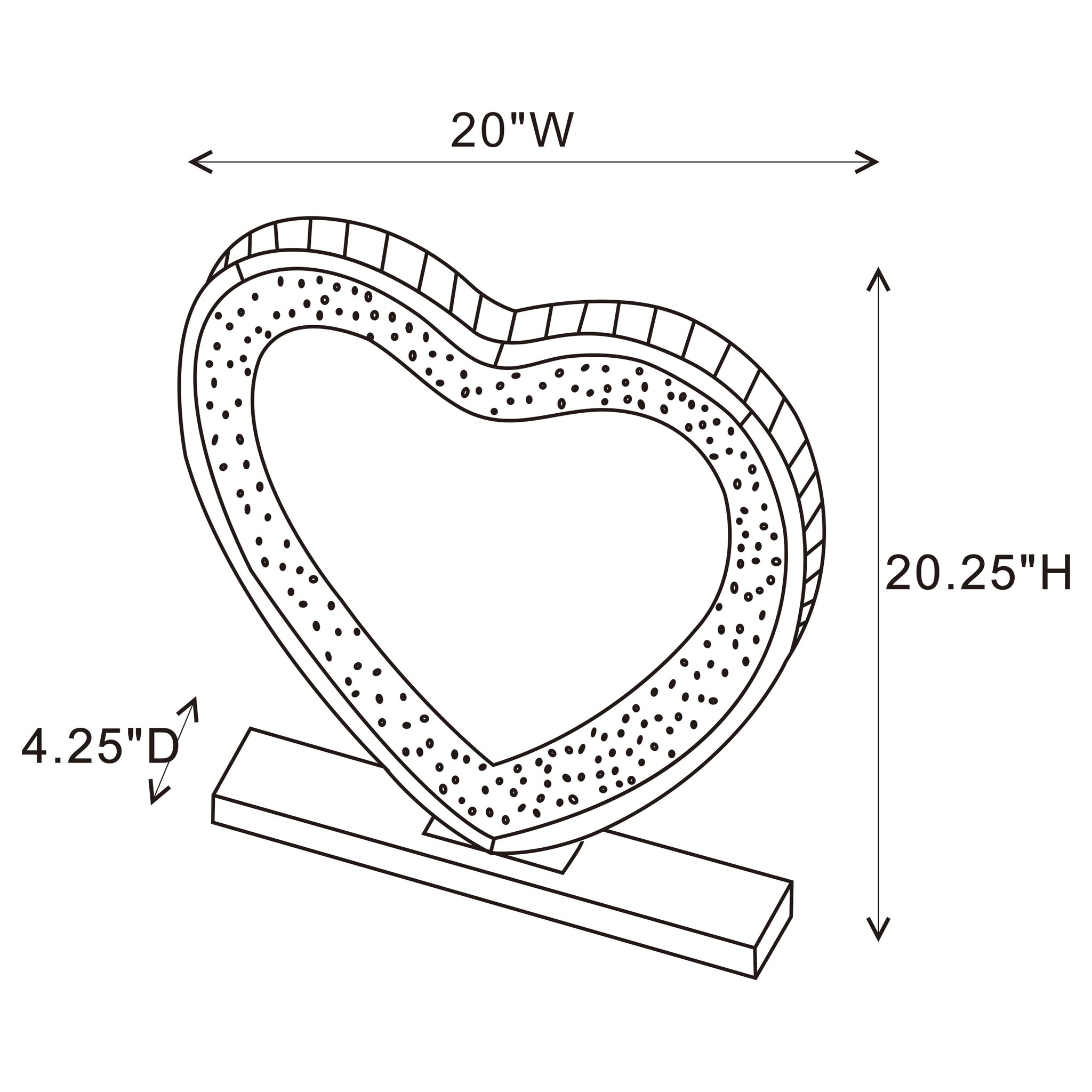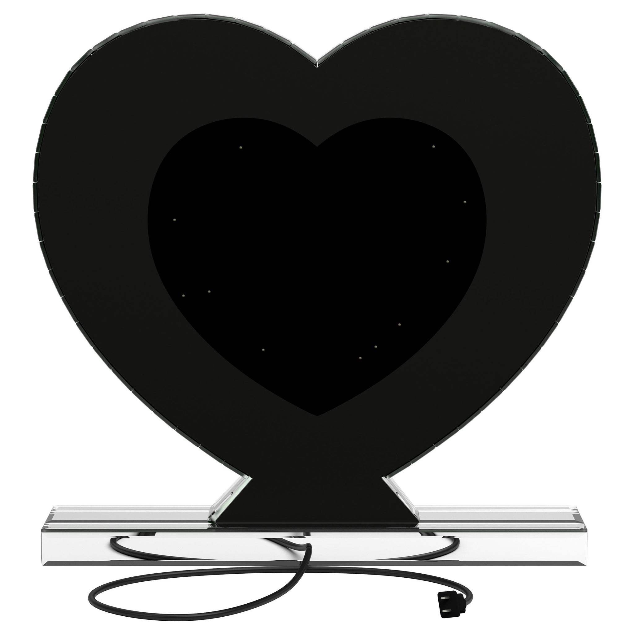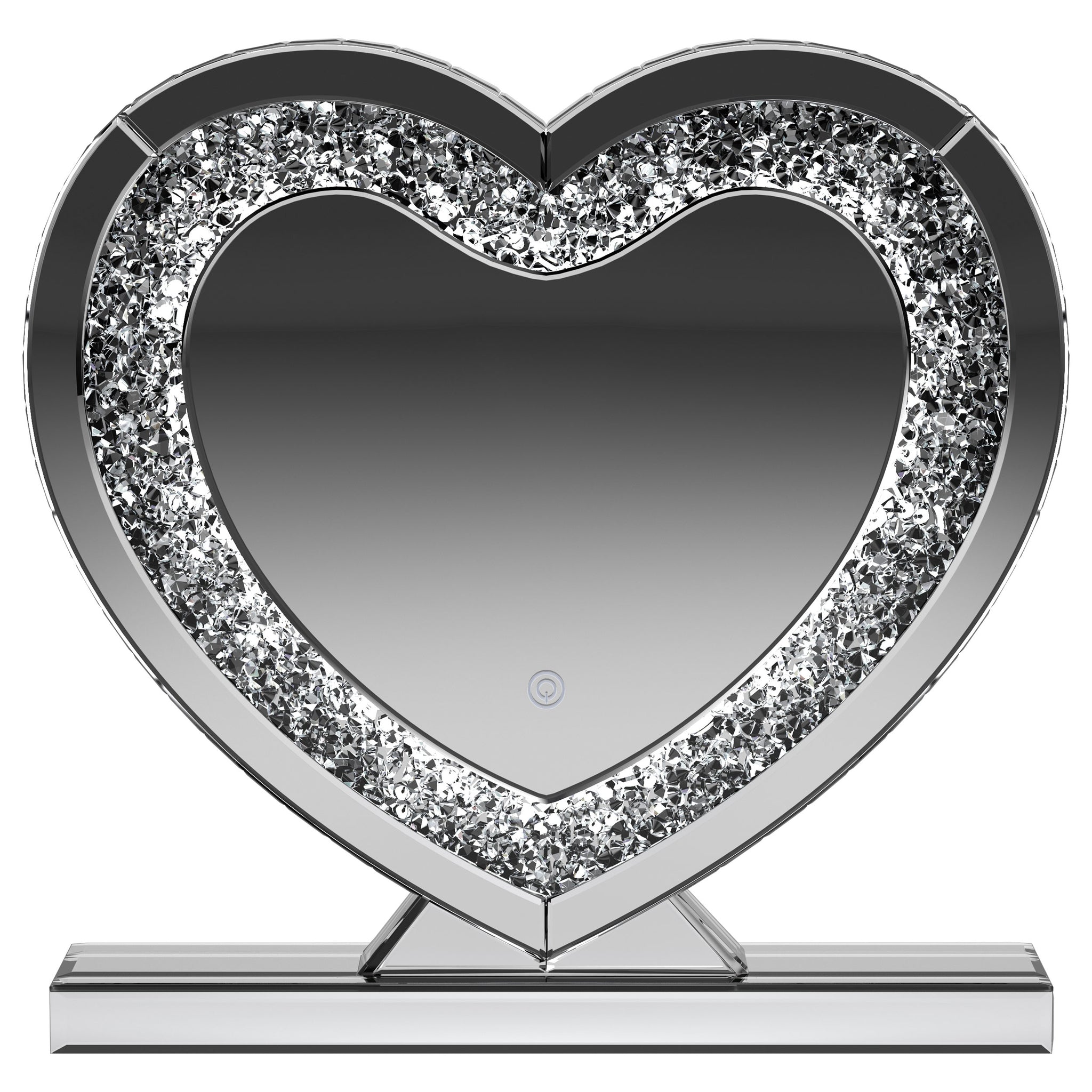 This heart-shaped table mirror blends glam style with practical lighting, perfect for vanities or dressing areas. The mirrored frame features an inset of faceted acrylic crystal inlay that catches light beautifully, while integrated LED illumination adds clarity for grooming or makeup application. Its freestanding design and decorative shape make it as functional as it is eye-catching, ideal for bedroom surfaces or beauty stations. Key Features: • Tabletop vanity mirror with a heart-shaped silhouette for decorative charm and function • Mirrored frame adds sleek shine and elevates the glam-inspired design • Inset acrylic crystal inlay creates a shimmering, textured border • Built-in LED lighting provides enhanced visibility for makeup and grooming • Freestanding base allows stable placement on dressers or vanity tops • Ideal for bedrooms, beauty stations, or glam-themed personal spaces