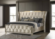 Indulge in soft glamour with this wingback bed, richly upholstered in a blend of ivory and camel velvet. A tall, button-tufted headboard curves out...